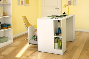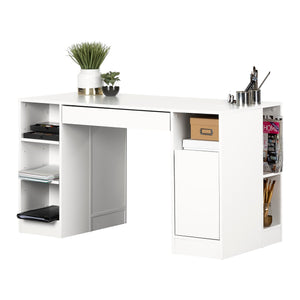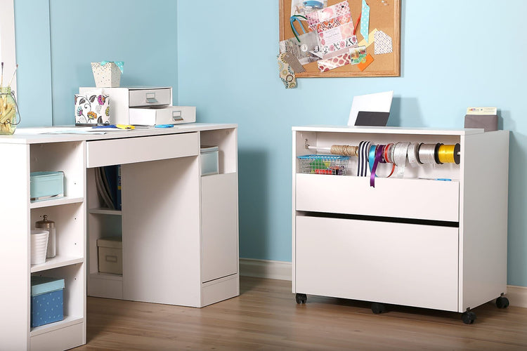 South Shore™ Crea craft table in pure white finish measuring 30" x 53" x 23" is made from non-toxic materials. Table is placed in a corner with narrow storage spaces that can be accessed from either side.