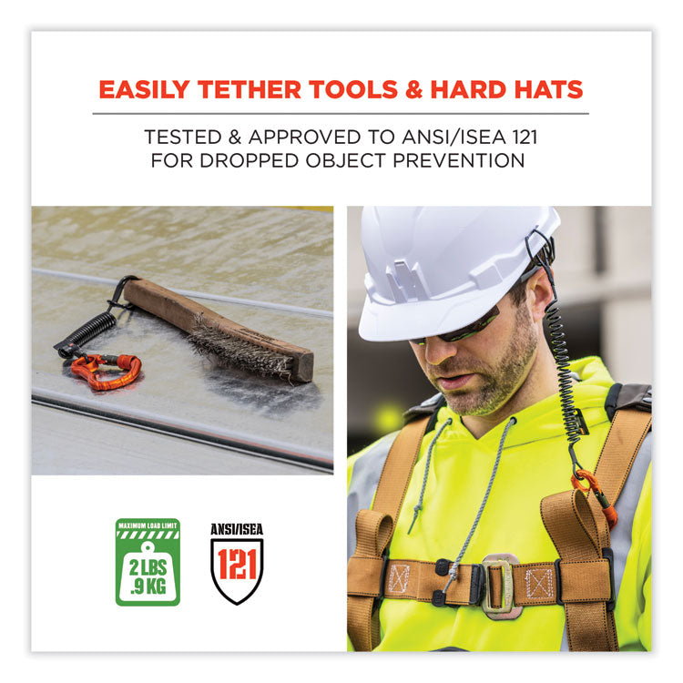 The Squids 3156 Coiled Tool Lanyard with Carabiner securely tethers hand tools, hard hats and other small gear to prevent them from becoming dangerous dropped object hazards while working at heights. The low-profile coiled design helps reduce the potential for snag and tangle hazards; and thanks to its manual locking screw gate aluminum carabiner on one end and a flexible tethering loop on the other, this versatile system provides a variety of options for getting a secure connection to anchor points, a tool's captive hole eyelets, retrofitted tool-attachment points and hard-hat accessory slots. Tested to be trusted and built to withstand harsh conditions, this lanyard is third-party certified to a maximum working capacity of 2 lb with a 2:1 safety factor.