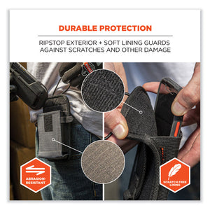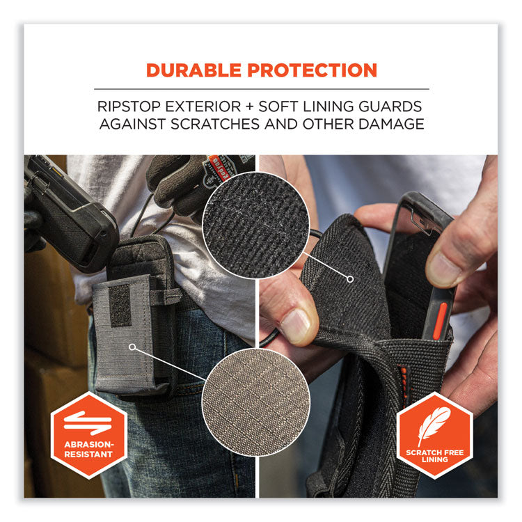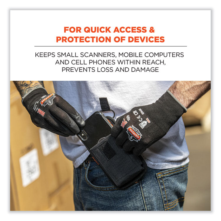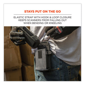 The Squids® 5542 Phone Style Barcode Scanner Holster with Belt Loop prevents costly drops or losses by keeping handle-less barcode scanners, mobile computers and even cell phones securely stored and conveniently accessible. With an easy-to-attach belt loop, the holster slides over and secures around belts without having to remove them. Unlike standard belt clips, the loop design also makes it possible to securely attach scanners to carts, equipment or fixtures. Built with abrasion-resistant ripstop polyester for work in the harshest environments, plus a fleece lining for protection from scratches. This barcode scanner holster is designed for convenient use with candy bar style scanners that do not have a handle. An elastic strap with hook-and-loop closure plus snug elastic sides ensure devices remain securely stored whether the holster is worn vertically or horizontally.