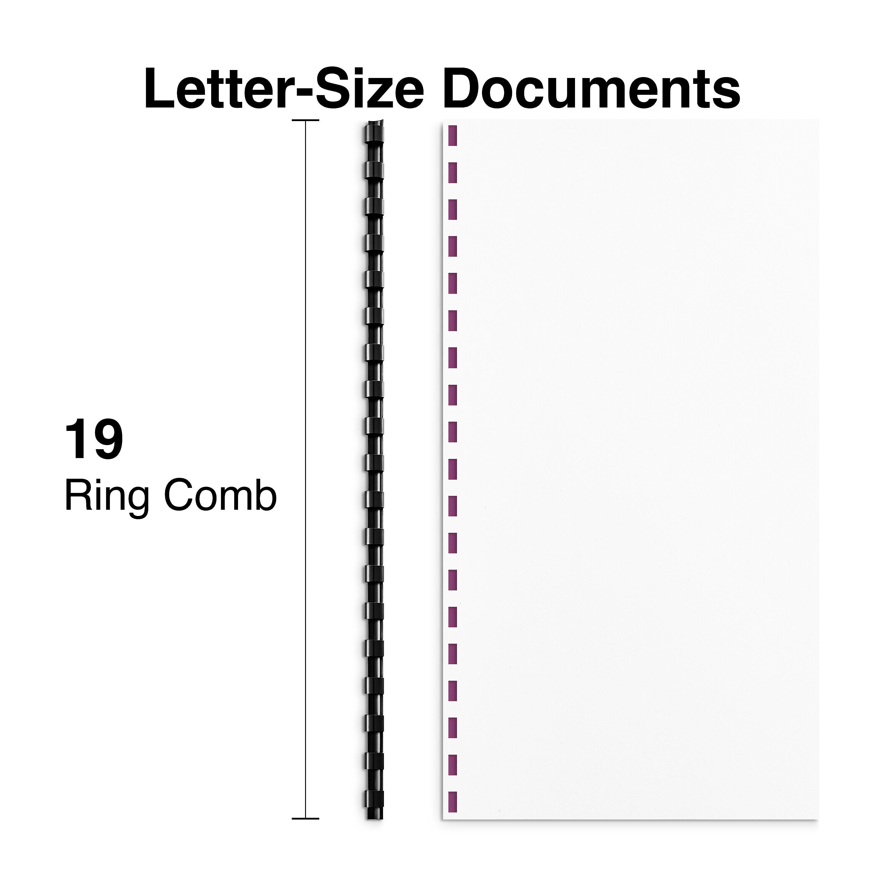 These black plastic comb binding spines have a 1/4-inch diameter and provide a custom look for your official documents. These spines can hold a 20-sheet document with a 19-ring comb binding system.