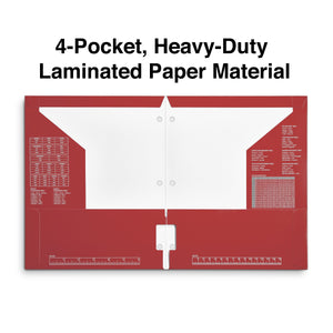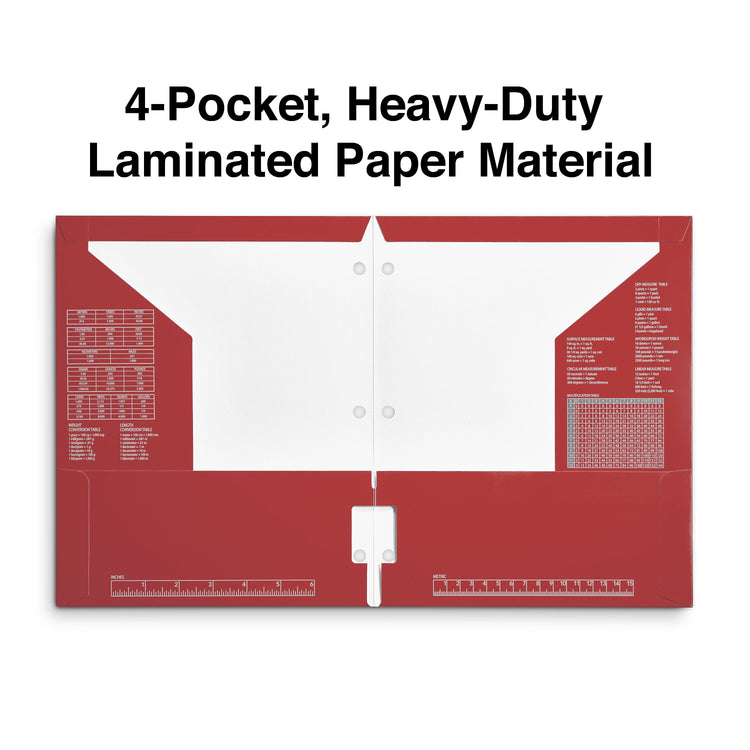 The 4-pocket folder comes in red and includes a weight and length conversion table, printed ruler in inches and metric with and has 2 horizontal and 2 vertical pockets, making it perfect for carrying presentation materials or everyday reports.