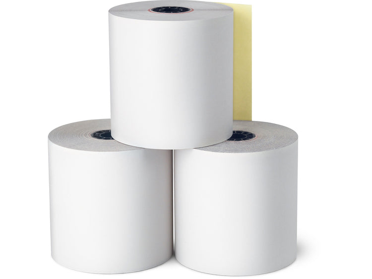 Maintain accurate records or calculate sales with this two-part adding machine roll. A red warning signal near the core of this roll indicates the paper is low to avoid running out during tasks, and the carbonless paper provides clear, fade-resistant duplicates without smudging. This two-part white and canary adding machine roll produces crisp, defined text or images and fits most cash registers and calculators.