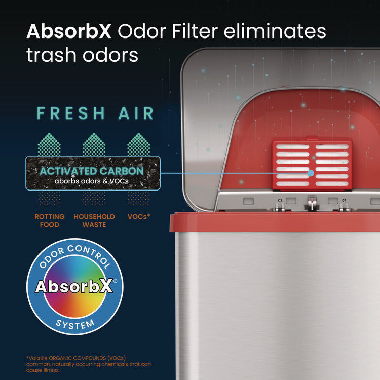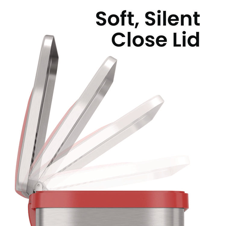 Step Pedal-Sensor Trash Can, 13 gal, Plastic/Stainless Steel, Silver/Red