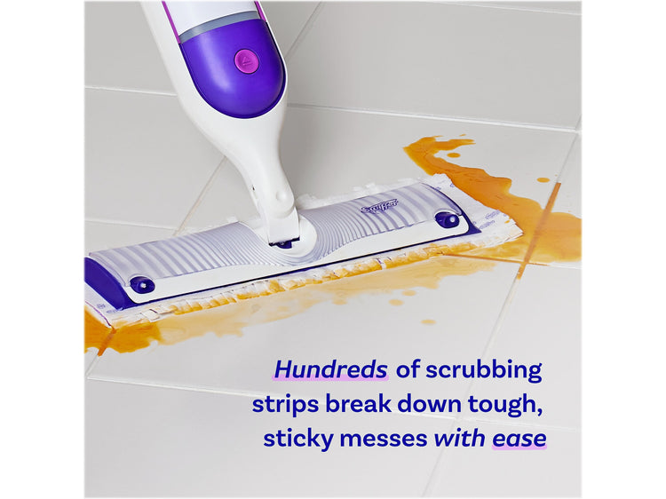 Mop smarter with this Swiffer PowerMop kit that gives you a mop and bucket clean in half the time. The included multi-surface mopping pads have more than 300 scrubbing strips that reach deep into grooves and grout to remove sticky spills and daily dirt and grime; and the premixed floor cleaner with Lavender scent breaks down tough, sticky messes and dries fast (no need to rinse).