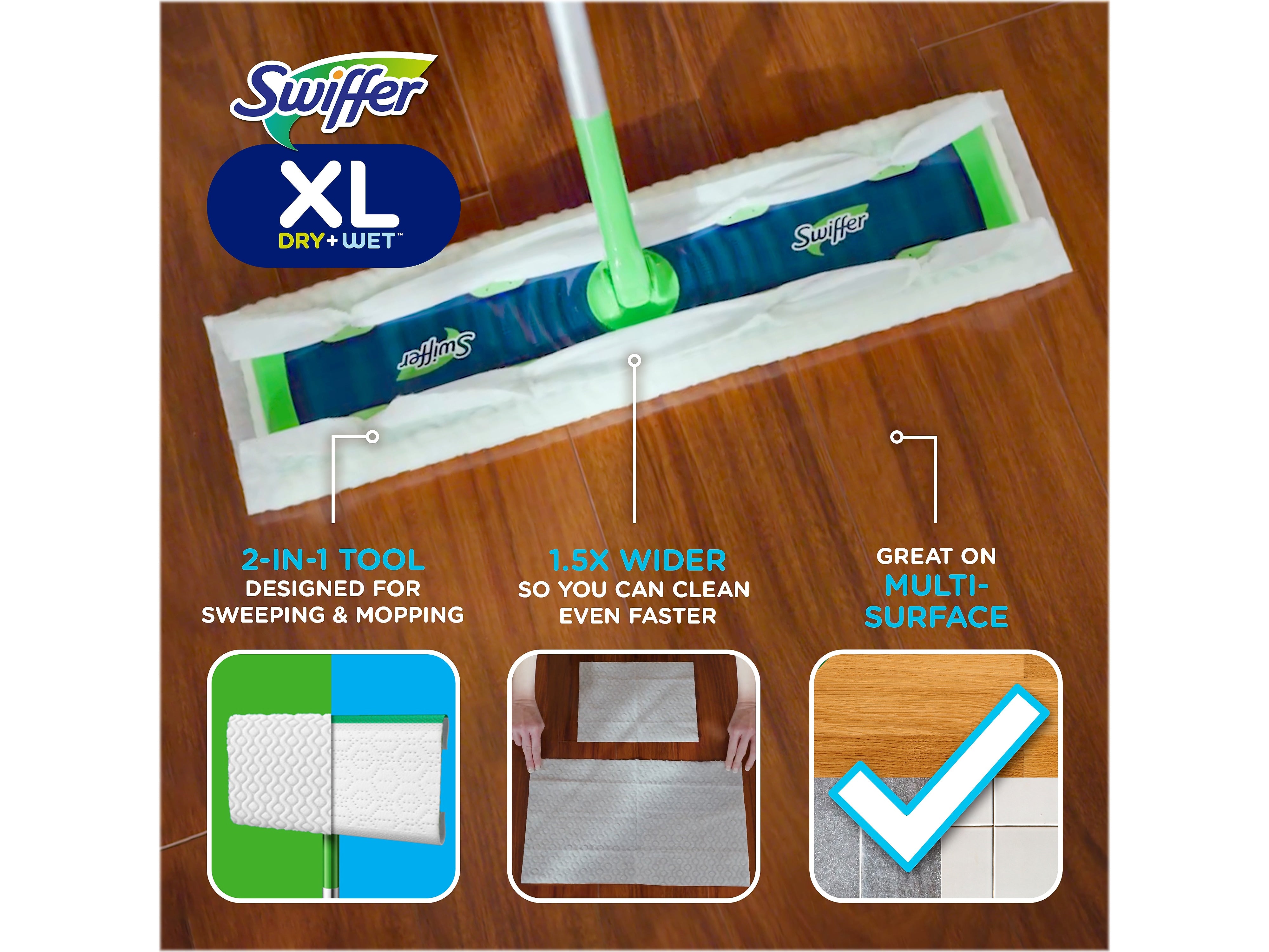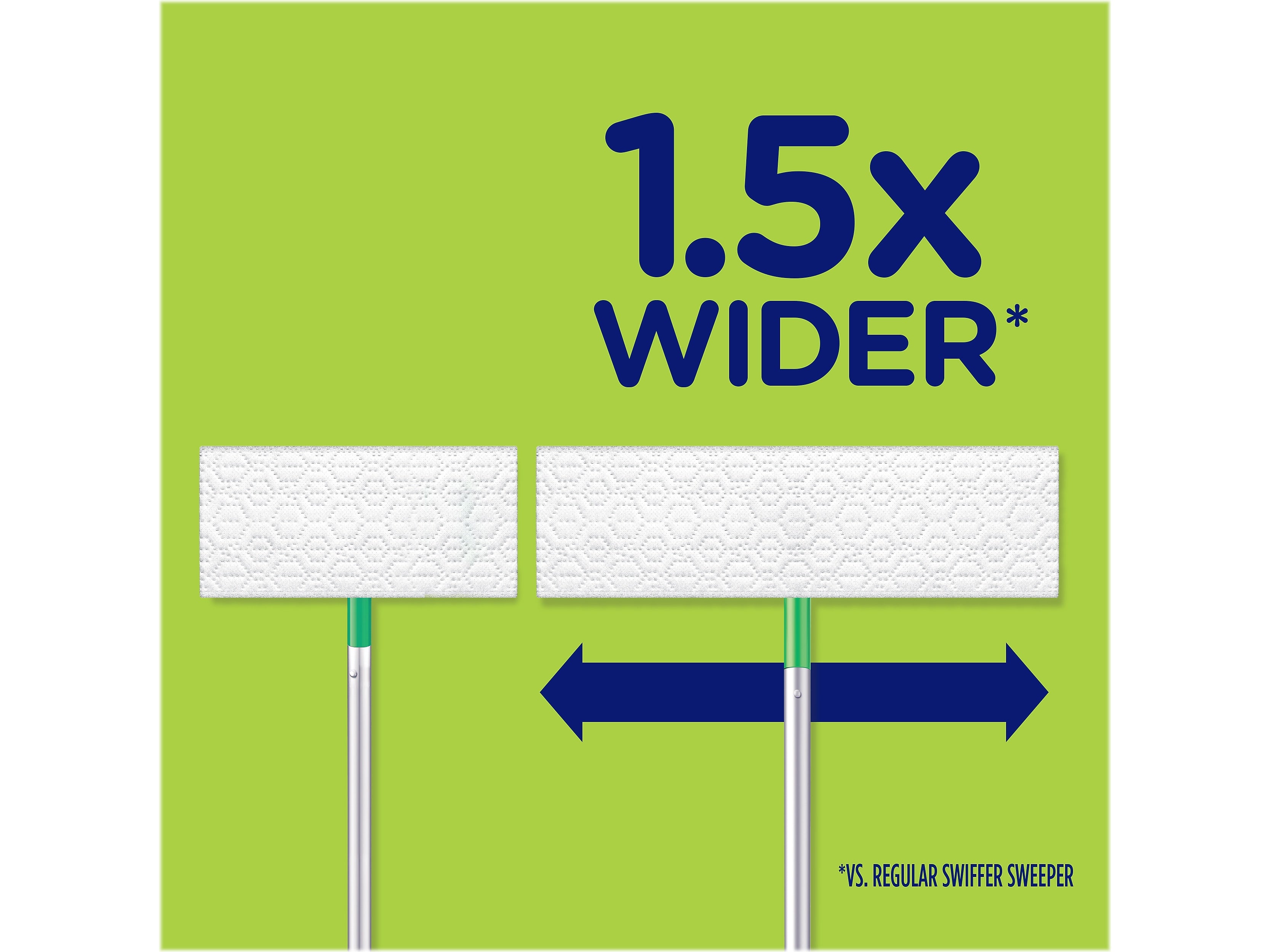 - Wider than the regular Swiffer Sweeper, making it quick and easy to clean large areas