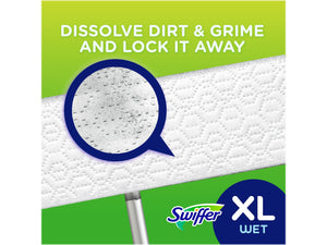 The Swiffer Sweeper XL Dry + Wet sweeping kit is a two-in-one multi-surface floor cleaner designed for both sweeping and mopping. Enjoy the convenient combination of a broom and mop for a quick and easy clean that gets the dirt out of your home once and for all, no dustpan or bucket required! The TRAP + LOCK dry sweeping cloths deal with dirt, dust, and hair, while the wet mopping cloths easily cut through grime. The Swiffer Sweeper XL is 1.5 times wider than the regular Swiffer Sweeper, so you can tackle larger areas.
