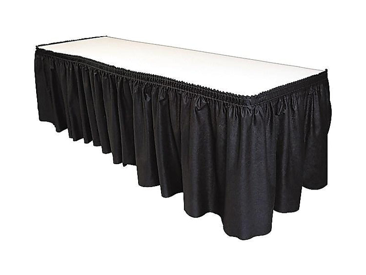 Cover and impress using this table skirt. This black table skirt is made from a non-woven polyester and nylon blend that is durable and easy to maintain. Simply put this skirt around a presentation table at a convention or sales event for a professional, finished look. This Tablemate table skirt measures 14-feet long and 29-inches high, and comes with an adhesive backing strip.