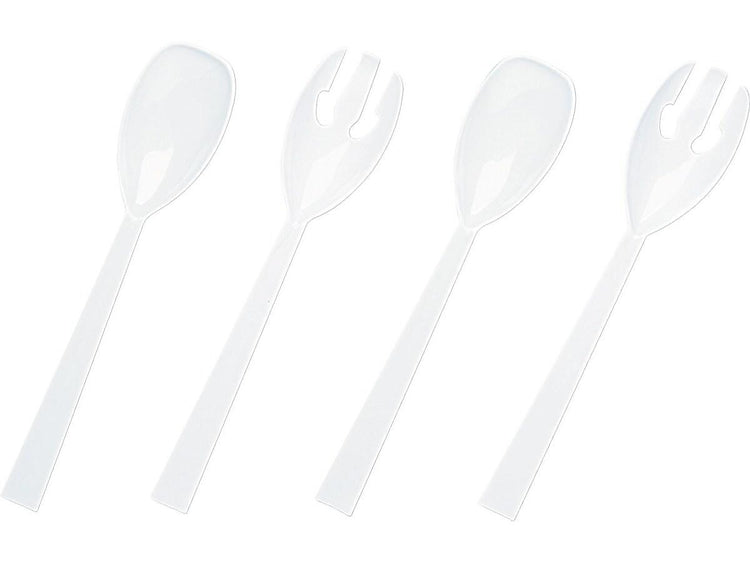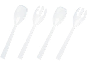 Keep these white plastic serving forks and spoons on hand for stocking up cafeterias or hosting culinary events. The thick plastic construction gives these forks and spoons the durability needed to resist splitting and splintering. These Tablemate plastic serving forks and spoons are white to provide a clean appearance and can be reused as desired.