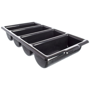 Tablecraft Cutlery bin in black color is made of durable polyethylene and has 4 compartments for easy storage. Bin measures 3 3/4" x 11 7/8" x 21 5/8" and is ideal for all kitchens.
