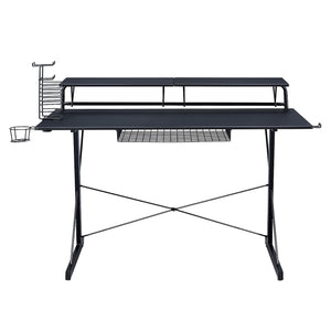 Here's a desk that is specifically designed for all your gaming gear so you can focus on that epic battle at hand. Totally equipped for your geekery, this desk features built-in headphone holder and media storage rack. Don’t worry, there's a cup holder for those long gaming sessions. It comes equipped with two elevated monitor stands to fit dual monitors. This desk is truly "Where comfort meets peak performance". Ready and easy to assemble. 5 year warranty. Color: Black Carbon Fiber