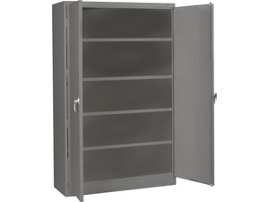 Need extra capacity for those big storage problems? This Tennsco Jumbo 48" wide cabinet provides 33% more storage space than a normal 36" wide cabinet. The cabinet offers five openings with four adjustable shelves, two brushed chrome handles (one locking with two keys), and a three-point locking system for extra security. Nylon lock-bar guides ensure smooth, quiet operation.
