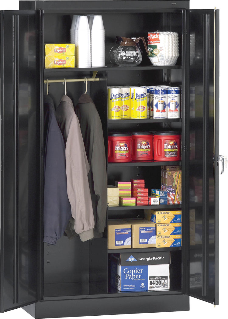 Versatile Combination Cabinet can handle coats, hats, supplies and much more. Ideal where space is at a premium. Shelves adjust in 2" increments. Design offers heavy-duty construction, reinforced doors and a three-point door locking mechanism for maximum security. Raised base keeps cabinet contents from contact floor moisture. Combination cabinet includes a coat rod.