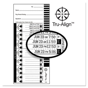 In/Out indicators on outside edge for more accurate print alignment. Gross to net payroll deduction area. Employee signature line for verification of time worked.