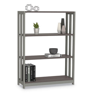 Stylish minimalist design for universal appeal. Scratch- and stain-resistant woodgrain laminate with durable edge. Adjustable leveling glides for stability. Quick and easy assembly in minutes. Strong powder coated steel frame with laminate shelves. Four shelves.