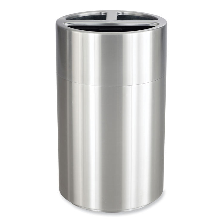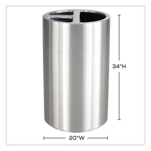 This classic Triple Recycling Receptacle features three separate waste sections and decals for waste, cans, paper, plastic and recycle to keep materials separated and to provide a multipurpose waste receptacle solution. The lid is removable for ease of use when removing recyclables or waste. This versatile receptacle features a 40-gal total capacity that includes one 20-gal rigid plastic liner and two 10-gal rigid plastic liners for easy separation of waste. Designed with aluminum for long-lasting durability and a sleek aesthetic that fits into a variety of spaces. Ideal for indoor use, this receptacle is great for use in breakrooms, cafeterias, conference rooms, open office spaces, lobbies, entrances or exits, and a variety of other spaces.