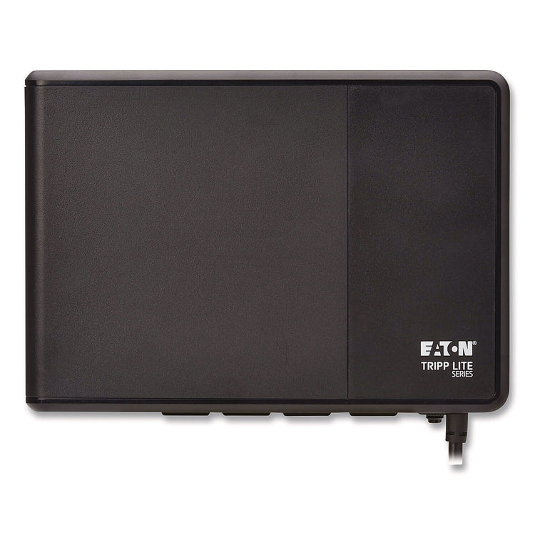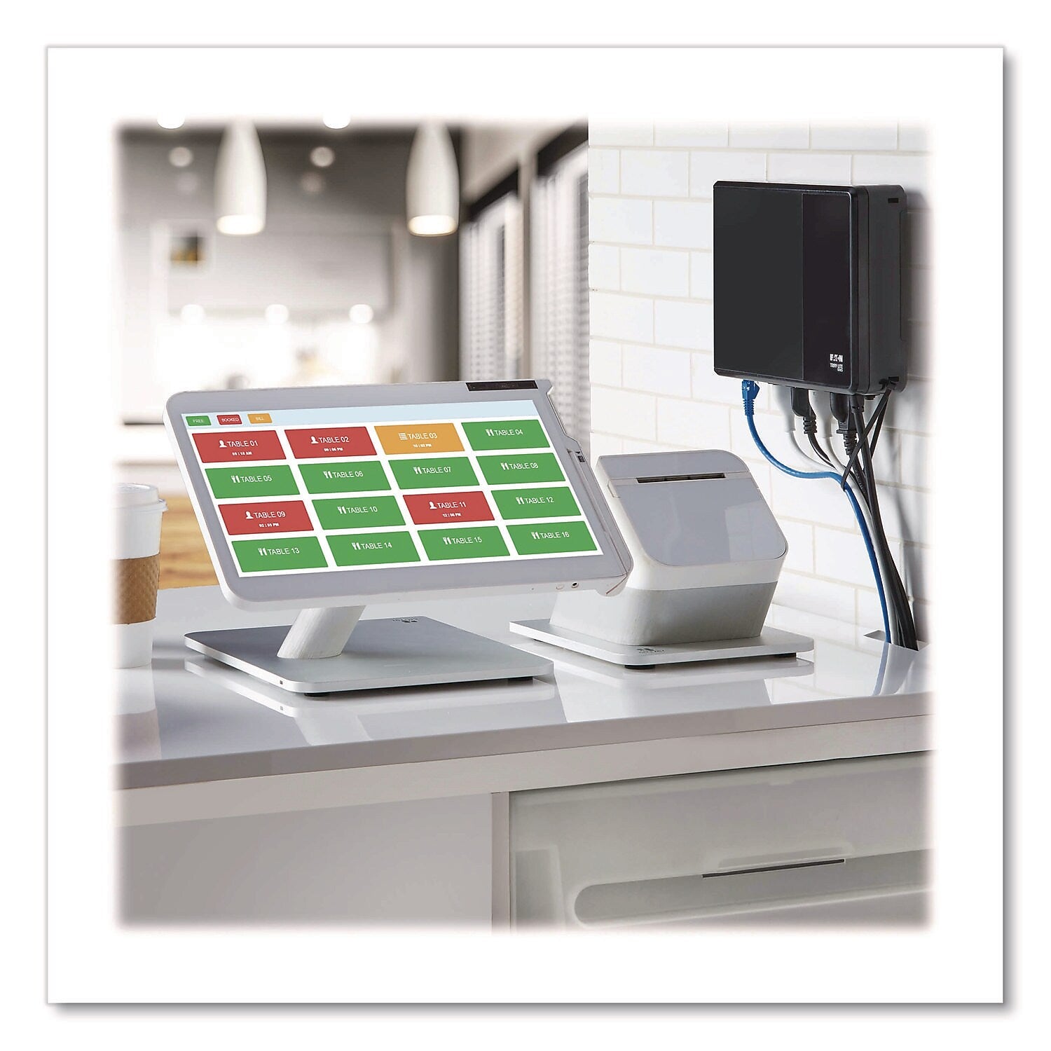 This standby Cloud-connected UPS system provides reliable battery backup and AC power protection against blackouts, brownouts, over-voltages, surges and line noise for home/office computing, networking and point-of-sale equipment in retail, kiosks, food service and light industrial environments. For easy access, the input power cable, Ethernet port, AC outlets, power button and status LEDs are all on the same side. Eaton's Cloud-based remote monitoring app offers convenient setup, control and management of a single UPS or a larger deployment. Scan the QR code on the UPS to download the app to your mobile device. Receive alerts, push configurations, silence alarms or control outlet banks using a mobile app or web browser. Being able to monitor and access an army of UPS systems from a remote location helps reduce the number of site visits, saving you time and money. The unit's NFC (Near-Field Communication) area lets you configure network settings instantly from your mobile device. Restarts automatically once power is restored, regardless of battery charge level, saving you a costly site visit. During short blackouts and brownouts, it switches to battery power to keep connected equipment running. This allows you enough time to save data and complete a safe shutdown in case of a longer outage. Four NEMA 5-15R outlets protect connected devices from the harmful effects of power surges. Also filters out disruptive electromagnetic interference (EMI) and radio frequency interference (RFI) that can destroy data and contribute to lengthy downtime. Self-test capability and user-replaceable internal battery can extend the life of the UPS and minimize disruption to operations. A resettable circuit breaker helps prevent dangerous system overloads. An audible alarm and a red LED indicate a low battery or fault condition. A green LED indicates power and line/battery mode status. The audible alarm can be disabled via the remote monitoring app, which will still respond to silenced alarms. The flatpack housing allows use in locations with higher ambient temperatures (operating temperature range: 32° to 122° F). The small size is suitable for desktop or floor placement. Secure mounting points on the bottom enable horizontal or vertical mounting and are spaced in a 100 x 100 mm VESA pattern for mounting to the back of a monitor with the included hardware. Attachment points allow installation on a shelf or beam with user-supplied cable ties. The five-foot power cord with NEMA 5-15P plug connects to any compatible AC outlet.