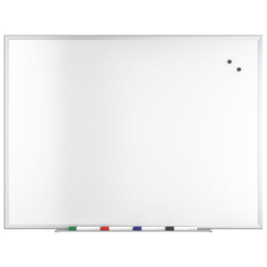This TRU RED™ whiteboard features a durable, non-porous magnetic painted steel surface that prevents marker ink from penetrating the board and makes cleaning just as easy as writing. The magnetic surface of the board is perfect for brainstorming additions like papers, photos, or designs. The large surface area of the board is easy to care for, perfectly sized for use in the office or the home, with an added versatility that allows vertical or horizontal placement. Clean when necessary but know that those long-term ideas can stay up without worrying about leaving a permanent stain.