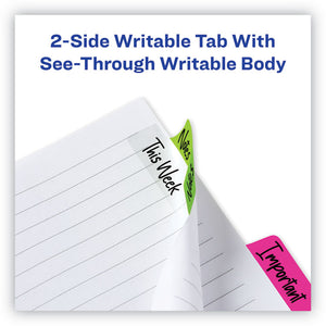 Sturdy, self-adhesive repositionable tabs that make indexing, marking, referencing and separating documents quick and easy. Writable on both sides of the tab, and the adhesive body is clear so you can see text underneath. Durable enough to turn pages like a divider, and they stick securely but remove cleanly with no residue. Ideal to use for organizing and marking key information in notebooks, files, books, planners and more. Perfect for home, office and school.
