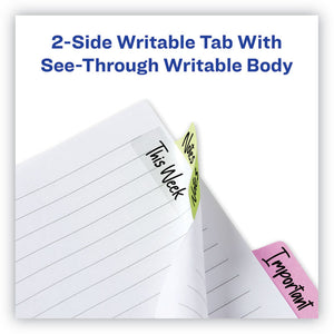 Sturdy, self-adhesive repositionable tabs that make indexing, marking, referencing and separating documents quick and easy. Writable on both sides of the tab, and the adhesive body is clear so you can see text underneath. Durable enough to turn pages like a divider, and they stick securely but remove cleanly with no residue. Ideal to use for organizing and marking key information in notebooks, files, books, planners and more. Perfect for home, office and school.