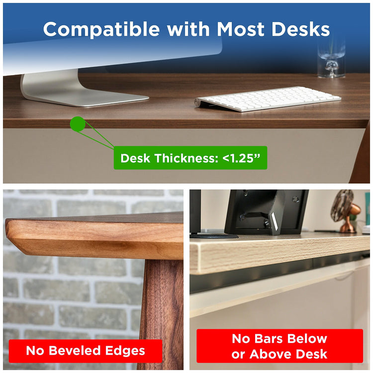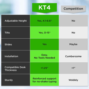 Create a healthier and happier typing environment with this clamp on keyboard tray under desk slide - your wrists will thank you! Designed to outperform, our unique clamp on under desk keyboard tray is adjustable in height, tilts, and slides in and out. Installation of this pull out keyboard tray under desk couldn't be easier - simply connect the screw clamps to your desk, slip in the under desk keyboard tray, and enjoy typing comfortably. This height adjustable keyboard tray is engineered to properly position computer keyboards at elbow height so your monitor is more comfortably positioned at eye height. This clamp on keyboard tray under desk is adjustable in height from approximately 4.1 to 6.6 inches below your desk. Say goodbye to desktop clutter as you store your computer keyboard under your desk with this clamp on keyboard tray under desk. The keyboard holder under desk is simple to install - screw the clamps to your desk and slip in sliding under desk keyboard tray. No tools are required to connect this desk clamp shelf to your worksurface. The clamps fit most desks under 1.25" thick and a spacing guide is printed on the clamp on keyboard tray's box to speed up installation without measuring. The KT4 keyboard tray under desk drawer slide out is an original design by Uncaged Ergonomics. With so many keyboard drawers & keyboard platforms out there, we engineered our novel KT4 clamp on keyboard tray to outperform other keyboard tray under desk clamp on designs. We packed this clamp on keyboard tray with all the features you need to type more comfortably and built it out of durable materials (high strength steel and composite wood) to create a long lasting, shake-free under desk keyboard drawer.