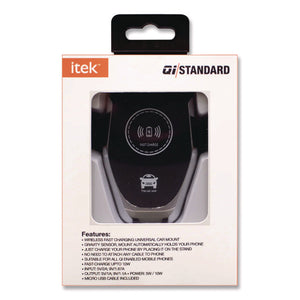 Wireless, fast charging universal car mount attaches to any car vent. Gravity sensor automatically holds phone when placed on it for easy and hassle-free, high-speed charging. No phone cable is required. Works with all Qi enabled mobile phones. Overcharge protection.
