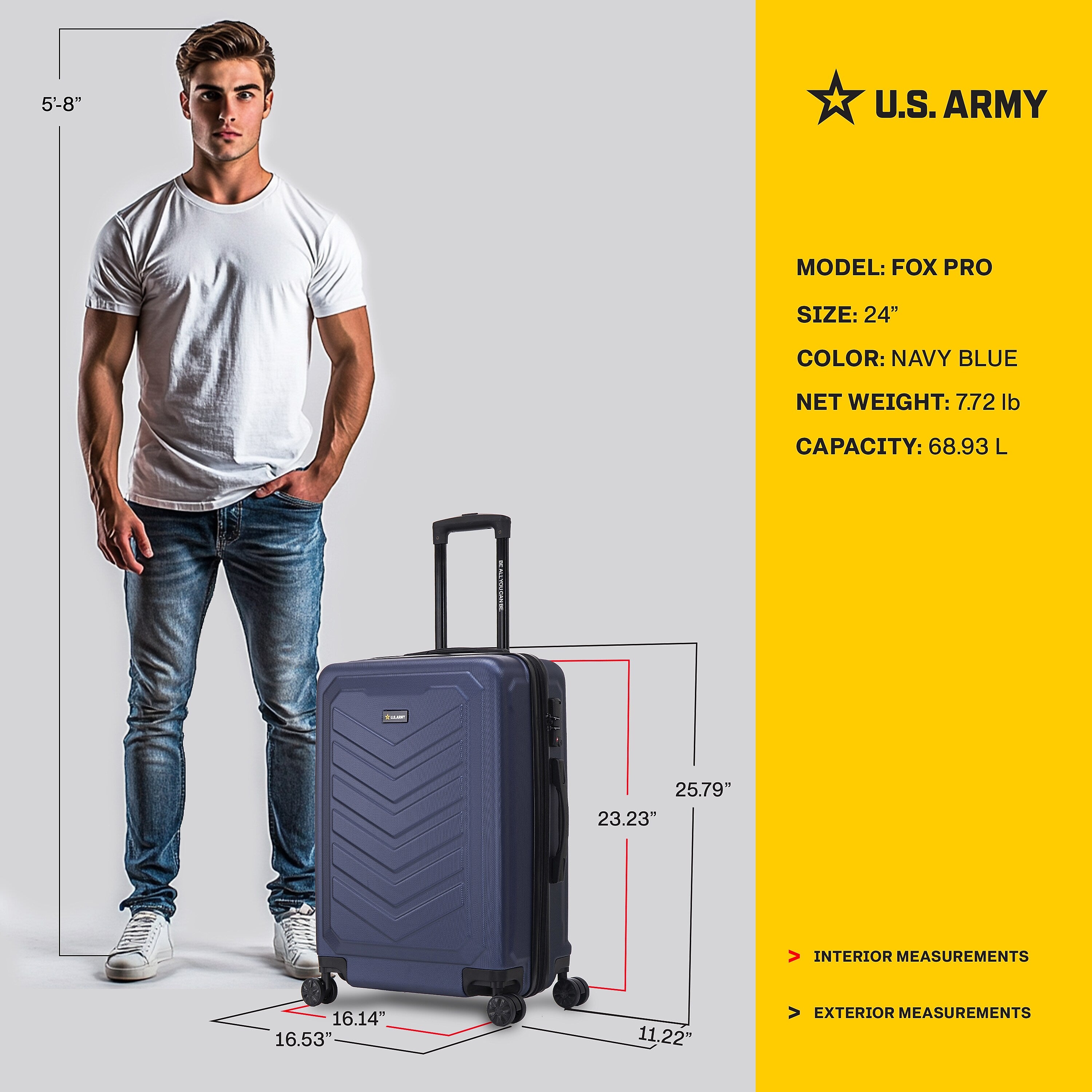 The U.S. ARMY FOX Pro Collection 24'' Medium Suitcase is a tribute to the bravery and strength of the U.S. Army. Tailored for the savvy adventurer, this versatile suitcase is perfect for 4-7 day journeys or when you need that extra space. Designed with the iconic Army chevron marks and other emblematic symbols, it captures the essence of resilience, offering the ideal balance between size and capacity. Crafted with a durable hard shell and rigorously tested to ensure high standards of quality. Inside, a spacious, organized interior, smooth-gliding spinner wheels, and cushioned handles make packing and travel effortless. The FOX Pro goes further by featuring an expandable zipper for added capacity and a built-in TSA-accepted lock for securing your belongings. Purchase of officially licensed U.S. Army merchandise aids the morale, welfare and recreation (MWR) program, which benefits the lives of soldiers, retirees, and their families.