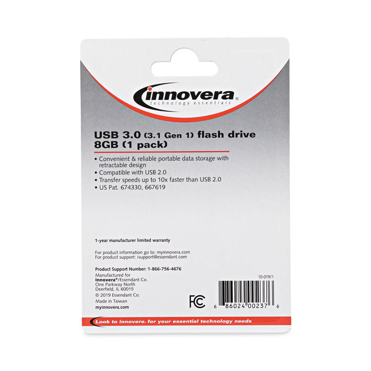 Innovera® USB 3.0 Flash Drive is an ultra-fast drive with a no-loss, retractable cap. USB flash drives are a convenient and secure way to move and store your digital files. Simple plug-and-play design. Great for sharing photos, presentations, files and documents. Great on-the-go flash drives that are perfect for packing in a laptop bag, briefcase, purse, or backpack for easy transfer of files from one computer to another. Compatible with all standard USB ports.