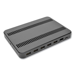 Whether you're at home or in the office, the 7-Port USB Charging Station provides enough ports and power to keep your devices at 100% capacity. No more peering behind furniture to find an available outlet or unplugging one device to charge another. You can charge up to seven tablets, smartphones and other devices at the same time. The charging station doesn't require a computer, so you can take it anywhere AC power is available. It features five USB-A ports, each capable of delivering up to 5 V, 2.4 A, which is enough for charging even battery-intensive devices. The USB-C port provides up to 5 V, 3 A for more powerful devices. Plus, a Quick Charge 3.0 port is capable of rapid-charging compliant devices up to four times faster than normal USB charging. In addition, this charging station doubles as a storage unit by providing space to neatly organize cabling while your devices charge. When not in use, cables can be stored in the compartment and kept out of the way. The included adjustable brackets accommodate the number and size of the devices being charged. To charge your USB devices, simply connect the five-foot power cord's NEMA 1-15P plug to an AC power outlet and connect your devices to the available USB ports. The unit protects against overheating, overcurrent and overcharging—in fact, it stops charging as soon as your devices' batteries are at full capacity. Also, each USB-A port complies with USB Battery Charging (BC) specification v1.2. The brackets and power supply store conveniently in the charging station when not in use.