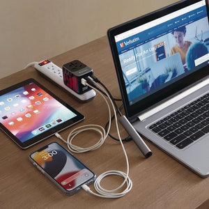 Convenient to carry, this compact adapter also allows six devices to be charged simultaneously through the AC power socket, USB-A and USB-C ports. The USB-A and USB-C ports on the bottom of the adapter charge your necessary USB devices including smartphones, Bluetooth speakers, tablets or power banks.