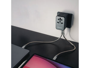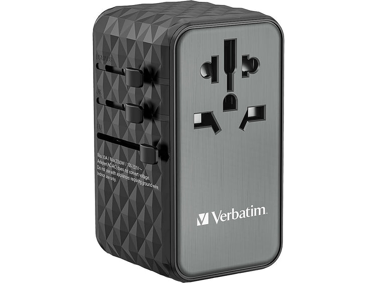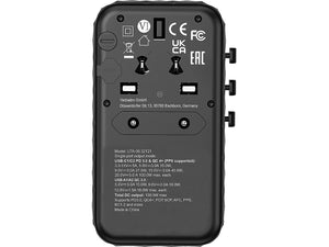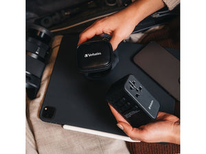 The Verbatim UTA-06 GaN III universal travel adapter can be used in more than 180 countries: take it everywhere with you and never be out of power. This multi-plug allows you to connect to any local power supply around the world and recharge your power-hungry devices such as laptops, smartphones, Bluetooth speakers, tablets, power banks, and more. Just push the sliders on the side of the multi-plug to reveal the three most common international plugs, EU, UK and US, and rotate the pins for sockets in Australia or China.