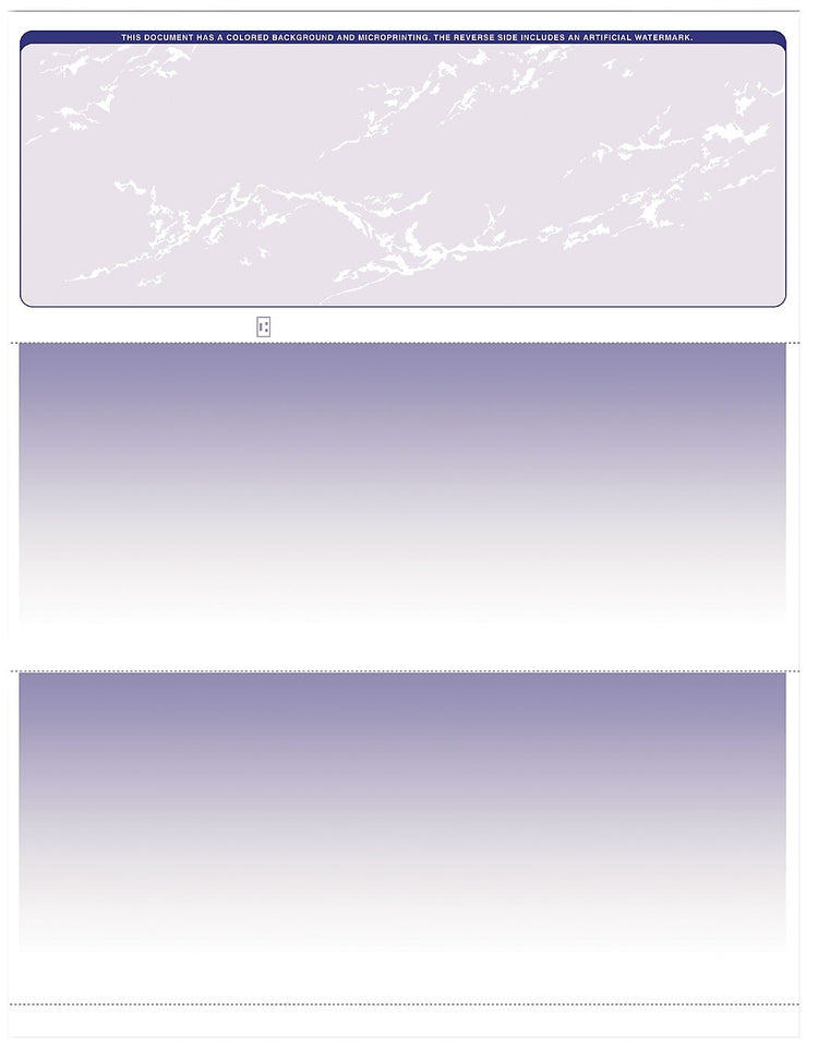 - Each 8-1/2" x 11" sheet has one business-size check on the top third of page, with two stubs below, micro-perforated at 3.5", 7" and 10.5".