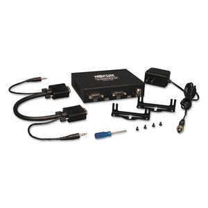 Allows you to split a single VGA and Audio signal into five (one local, four remote). Increase the number of displays to up to 25 (one local, 24 remote) by daisy-chaining up to six B132-004A-2 units together. The range and number of monitors can be further expanded by adding repeater units. Connect up to four remote units in a repeater chain (three repeaters and one receiver), with a monitor at each location. A 1920 x 1440 (60 Hz) signal can be extended up to 500 ft from the first repeater in the chain to the last receiver. Support for video resolutions up to 1920 x 1440 (60 Hz). A 1024 x 768 (60 Hz) signal can be extended up to 1,000 ft from the first repeater in the chain to the last receiver. The transmitter unit features functionality that allows for the EDID information from a connected display to be copied and sent to the connected computer, providing optimal compatibility. Includes mounting hardware that allows unit to be wall-mounted, rack-mounted or pole-mounted.