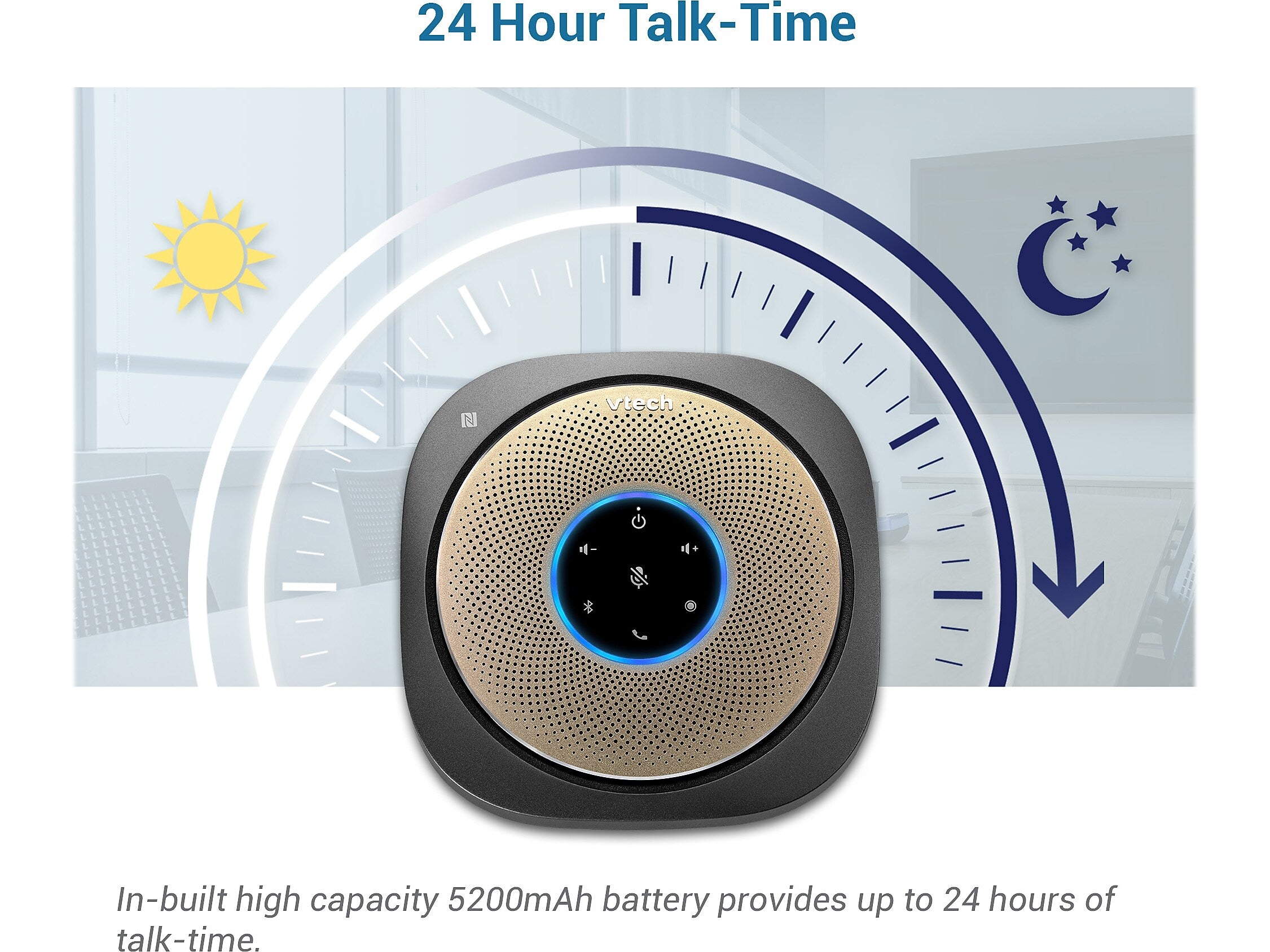 The VTech VCS601-2 Bluetooth conference speakerphone offers quick and easy connection to your smartphone, tablet, or laptop to meet your communication needs. The speakerphone includes six microphones to provide true 360-degree coverage to ensure users are heard from every angle and distance, while the echo cancellation helps eliminate background noise and ensure crisp, clear communication. The large 3W speaker provides a premium sound performance for listening to music while you work or take that important audio- or videoconference call. The built-in 5200mAh battery supports up to 24 hours of talk time and doubles as a USB power bank, so you can keep your smart devices charged while on the go.