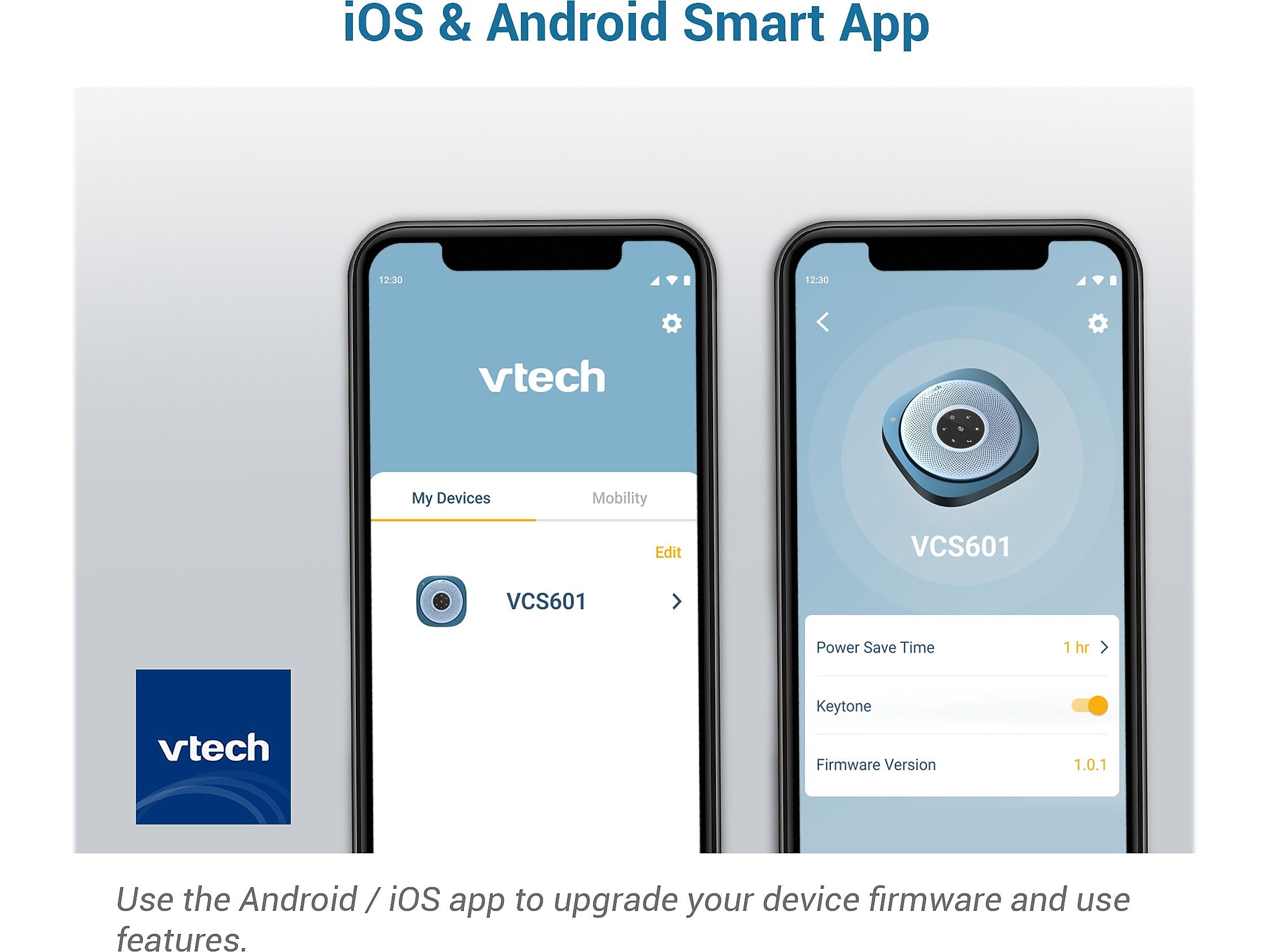 The VTech VCS601 Bluetooth conference speakerphone offers quick and easy connection to your smartphone, tablet, or laptop to meet your communication needs. The speakerphone includes six microphones to provide true 360-degree coverage to ensure users are heard from every angle and distance, while the echo cancellation helps eliminate background noise and ensure crisp, clear communication. The large 3W speaker provides a premium sound performance for listening to music while you work or take that important audio- or videoconference call. The built-in 5200mAh battery supports up to 24 hours of talk time and doubles as a USB power bank, so you can keep your smart devices charged while on the go.
