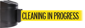 WallPro 300 "CLEANING IN PROGRESS" Black wall mount belt barrier comes with 7.5' yellow/black color belt for added safety. Belt barrier is specially designed for restricting access to work or cleaning areas.