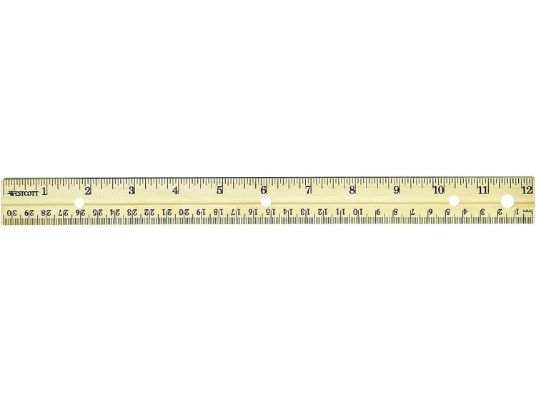This Westcott ruler is made from wood with beveled edges. Ruler is hole-punched, features imperial and metric scales and is treated with a clear lacquer finish. Extra margins at the ends for clear starts and stops. Measures up to 12".