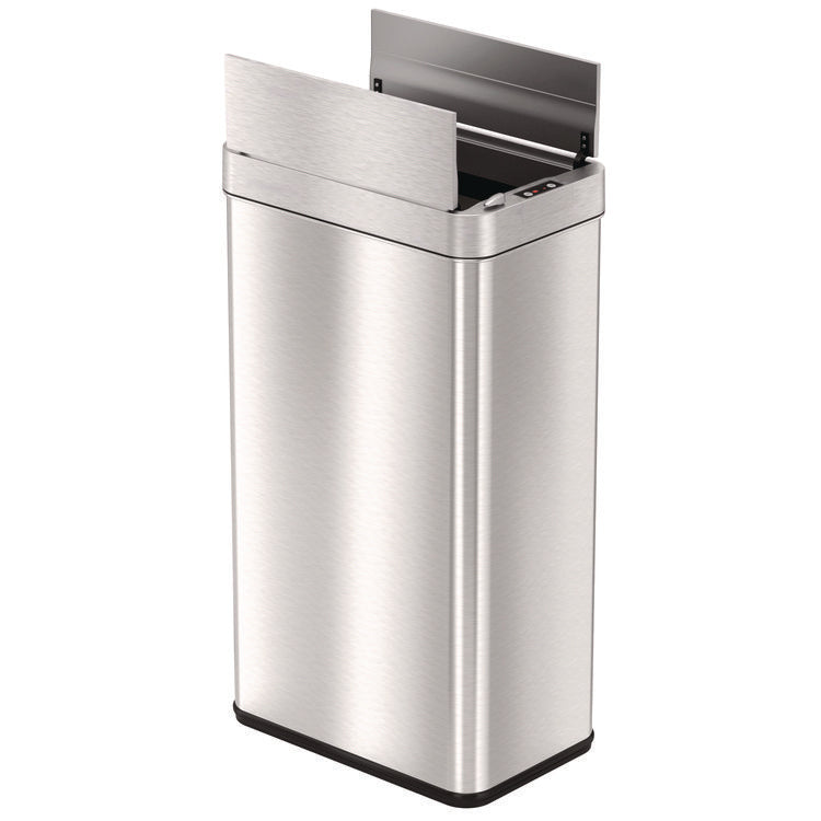 Upgrade your waste management with our wings lid sensor trash can, designed for ultimate hygiene and convenience. The 100% touch-free automatic lid ensures a sanitary disposal experience, while a replaceable odor filter keeps the surrounding area fresh and clean. Crafted with a durable stainless steel body and an ABS plastic lid, this bin combines durability with style. Its slim, space-saving design fits seamlessly into any setting. Powered by four C size batteries (not included) or an optional AC adapter (sold separately), it is perfect for restrooms, foodservice areas, hospitality, medical, multi-family residential, and retail environments. Enhance cleanliness and efficiency with this practical and elegant solution.