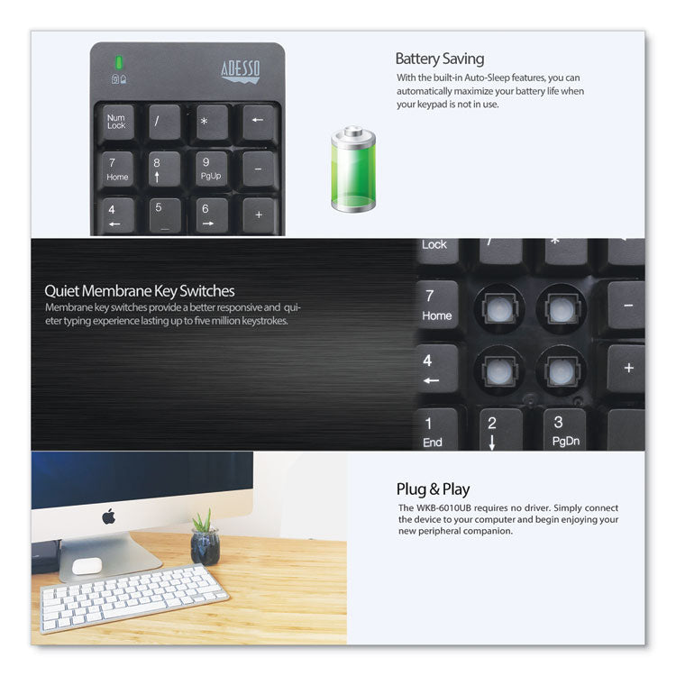 The Adesso WKB6010UB 18-key wireless keypad is extremely compact and lightweight. Its wireless feature eliminates any unnecessary wires and keep your working station neat and organized. Quiet membrane key switches provide a quiet typing experience that last up to five million keystrokes. Perhaps the greatest feature that the WKB601UB has is that it is spill resistant. The structural design of the casing is meant for fluids to exit out of the unit in case of accidental spills. Next time when you accidently spill drinks while using your numeric kepad you can be assured those fluids will not trap inside the keypad causing damage to your device.