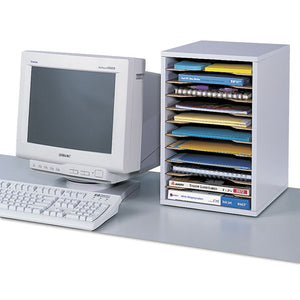 Vertical desktop sorter is compact for maximum desktop organization. Shelves are removable only during assembly so you can customize the compartments. Ten hardboard shelves form up to eleven 9 1/2w x 11 5/8d x 1 1/4h letter-size compartments and support up to 15 lbs. each. Made of 1/2" compressed wood with laminate finish; solid fiberboard back.