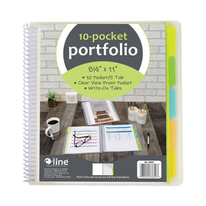Organize projects, subjects, notes and more in one convenient place. Suitable for both students and professionals. Ten interior pockets allow for detailed organization. Write-on tabs make for quick and easy custom organization; works with pencil, ball point pen or permanent marker. Spiral-bound portfolio features clear-view front pocket for cover sheet. Made of heavyweight acid-free polypropylene. For 8.5" x 11" document storage. Clear cover and pockets with assorted color tabs. This product will be cheerfully replaced with one of equal value if defective in materials, manufacturing or packaging at the time of purchase. Except for such replacement, this product is sold without warranty or liability even though defect, damage or loss is caused by negligence or other fault.