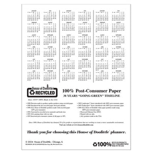 Enjoy the 1920's art deco period with this monthly planner. This recycled monthly planner features an art deco design on each monthly layout. It is gold wire bound with a black embossed leatherette cover to withstand the daily use throughout the year. Lightly ruled daily blocks keep notations neat. Includes a three-year reference calendar page and a three-year holiday page. Go sustainable with House of Doolittle products, we print on recycled paper with soy-based inks. Wire binding is recycled material and cover is also recycled material. Since 1989 House of Doolittle has donated 5% of its profits to organizations that are working to create a more sustainable environment.