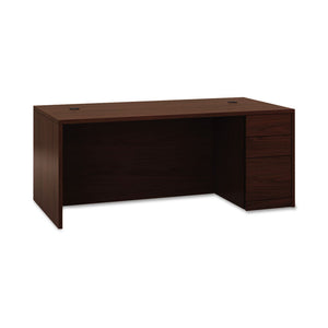 Hard-working, good-looking and built to survive a lifetime of overtime. Thermally-fused laminate top and end panels are abrasion- and stain-resistant. Drawers operate on ball bearing suspensions; file drawers extend fully and accommodate letter or legal size hanging files, box drawers extend three-quarters. 10 1/2" conference overhang provides kneespace for guests. HON® "One Key" core removable locks make re-keying quick and easy. Full-height modesty panel for privacy. Two cord management grommets. Desk and Return sold and shipped separately--ORDER BOTH.