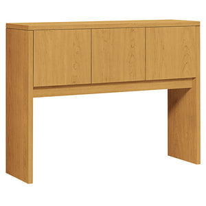 Keep your clutter behind closed doors! Durable woodgrain laminate is scratch-, stain- and spill-resistant for years of trouble-free performance. Clean, straight edges deliver a streamlined look. Enclosed storage behind self-closing, adjustable hinged doors. Valance and wire access facilitate optional task lighting.