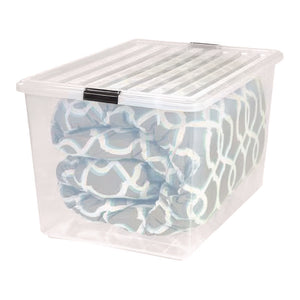 This Iris 132 qt. clear storage box is oversized to fit large storage needs. Securely stack multiple units to maximize storage space. It is great for storage in the garage, basement, attic, or closets.