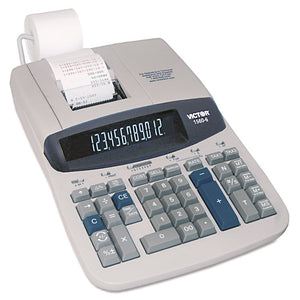 Victor professional grade heavy duty commercial printing calculator. Features financial and loan calculations. Large 12-digit fluorescent display. Fast 5.2 LPS 2-color ribbon printer. Amortization Feature. Future/Present Value Calculations. Days Between Dates Calculations. Installment Loan Calculations. Time Calculations. 2 Independent Tax Keys. Cost/Sell/Margin Keys. Time/Date feature displays and prints current time. PC Touch Keyboard. 4-Key Independent Memory. Delta percent-percent of change. Change Sign Key. Grand Total Key. Percent Key. Date/Non-Add Key. Sigma Key. Backspace Key. Square Root Function. Units Price Mode. Item Count with Averaging. AC Powered.