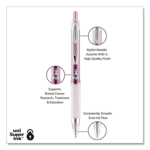 Champion the cause of breast cancer research with these Pink Ribbon Edition 207 Retractable Gel Pens from uni-ball. The 0.7 mm medium point gel pens have a beautiful pink barrel with stylish metallic accents and a Pink Ribbon logo. From the sale of each Pink Ribbon gel pen product, uni-ball donates $0.50 to City of Hope for breast cancer research, treatment and education. Even-flowing, pigment-based gel ink delivers a smooth writing experience for intense, vibrant lines, ensuring that every mark is brilliantly communicated. Use these retractable gel pens for everyday writing tasks, check signing and all of your important signatures, trusting its quick-drying uni Super Ink. Innovative uni Super Ink technology effectively entraps the gel ink into the paper, producing fraud, fade and water-resistant documents that resist check washing or bleaching. The 0.7 mm medium point strikes the perfect balance between bold and detailed lines. A textured grip offers greater comfort and control as you continue writing, while a translucent ink window indicates the level of gel ink remaining, so you don't run out unexpectedly. Give purpose to your purchase with the Pink Ribbon Edition 207 Gel Pen.