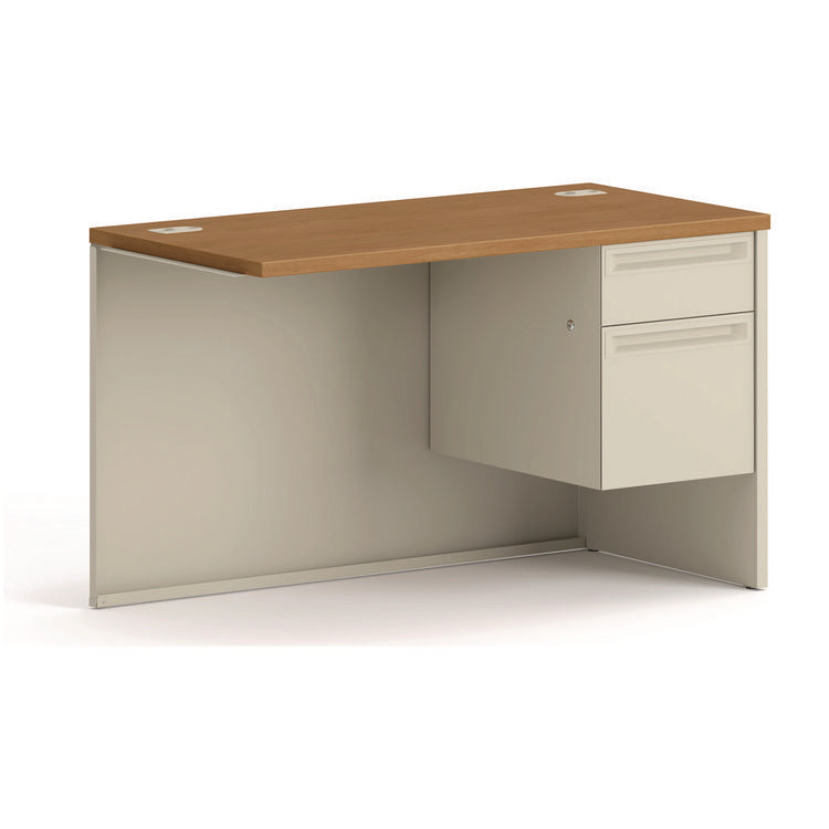 High-pressure laminate top is moisture-, scratch- and stain-resistant. Drawers operate on steel ball bearing slides. Tru-fit mitered drawers with a removable core lock. Cord management grommets and modesty panel. Not freestanding. Attach to single pedestal desk or L-workstation desk to create an L-workstation.