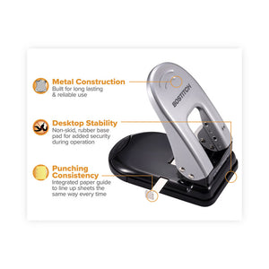 With this Bostitch two-hole punch PaperPro technology, easily two-hole punch sheets, jam-free. Designed with sleek, comfortable curves and a durable all-metal design for long-lasting performance. To ensure consistent hole placement, the punch has an integrated paper guide and ruler. For maintaining a clean work environment, the base holds the chip waste and can be emptied through the flip-open door. Ideal for the home, office or school, this hole puncher is the perfect tool for any setting.