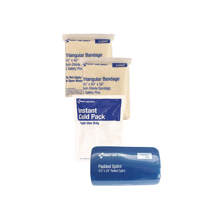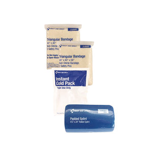 Quick convenient kit has essential supplies to treat CPR, sprains and strains emergencies. Contains CPR face masks along with splints and triangular bandages for sprains and strains. Grab-and-go treatment pack can stand on its own and is easy to carry to an emergency. Each first aid item's intended use is printed on the back of the bag. Bag is resealable. Sold as a separate treatment pack or as a refill for the 91170 Emergency Response Bag.