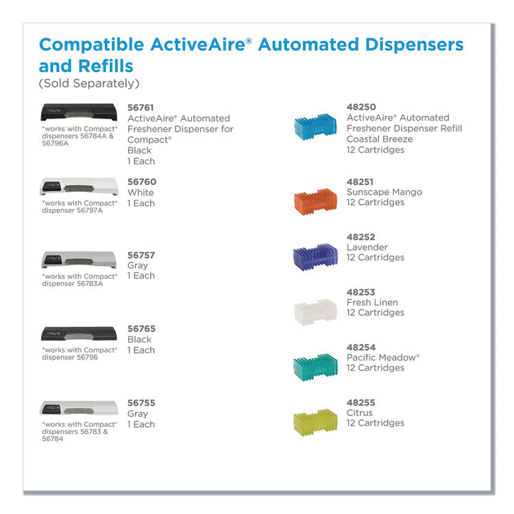 - Compatible with ActiveAire Freshener Dispensers and Compact 2-Roll Side-by-Side Coreless Toilet Paper Dispensers.